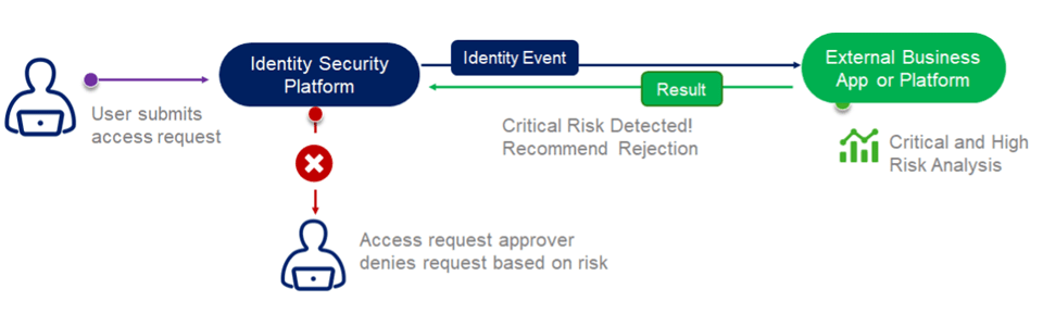 For example, when a user requests access, the identity security platform automatically knows that for this type of request it needs to pass the event on to a critical, high-risk analysis application for evaluation. Thus, when the identity security platform receives the analysis recommendation, the interaction is complete and the access request approved or denied.