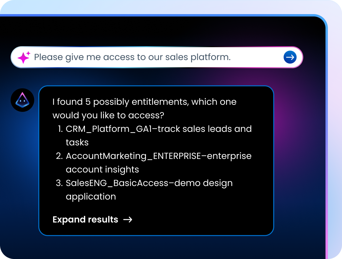 Ask questions using natural language to learn more about the current state of your Identity Security Cloud environment. Find the important information quickly, right when you need it, without having to spend time diving through the data yourself.